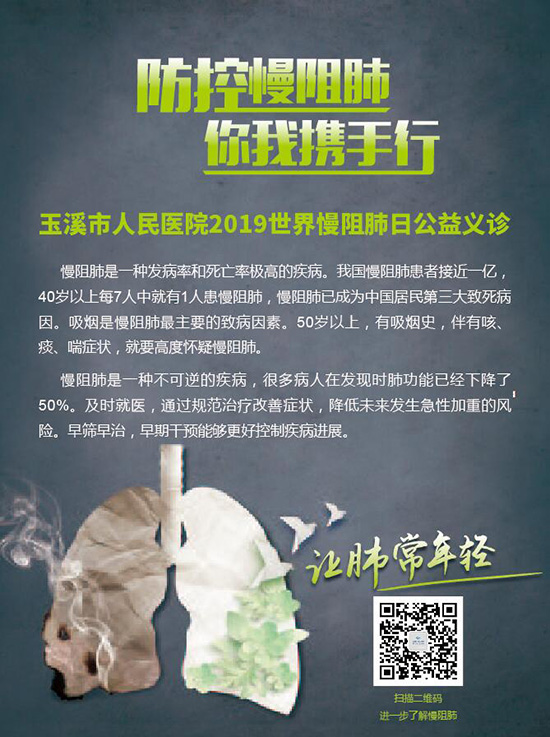 2019年11月20日是第十八个“世界慢阻肺日”,主题是“防控慢阻肺,你我携手”。玉溪市人民医院呼吸与危重症医学科将于当天开展“世界慢阻肺日大型系列公益活动”。