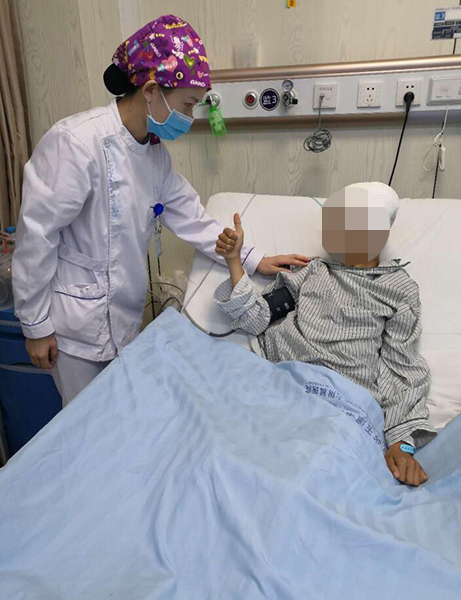 术后,因术中留置气管插管,拔出气管插管后咽喉疼痛难耐,原本性格内向的小华更加不愿交流说话,有些抵触医护人员。但在优质护理的理念下,神外二科的医护人员无数次耐心细心地帮助,小华慢慢有了精神,开始和护士简单交流,并为她们的细致工作点赞说:“你们特别好。”