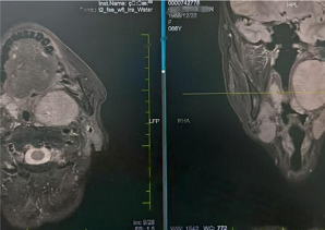通过MRI检查发现郭女士的左侧咽旁间隙见一团块状异常信号影,病灶大小约为3.5cm×4.4cm×5.4cm。病灶上缘达翼突内外板水平,下缘达颌下腺上缘水平,周围邻近组织受压移位,咽腔受压变窄,左侧咽隐窝受压变浅,左侧翼内肌、翼外肌外上方移位,外后方紧贴左侧腮腺。初步诊断为咽旁间隙周围神经和自主神经交界性肿瘤。