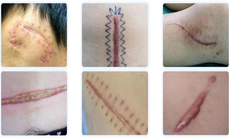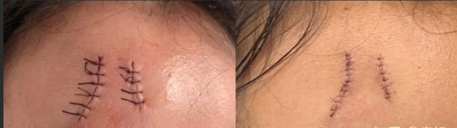 1.蜈蚣样疤痕:粗线、高张力缝合导致的针脚凸起和疤痕增生。