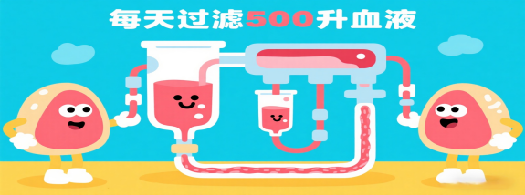 每天过滤约500升血液,清除代谢废物、多余水分和盐分,生成尿液排出体外;同时留住蛋白质、葡萄糖等营养物质,维持身体干净运转。