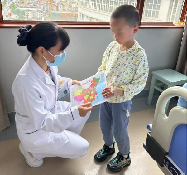 一位孩子拼好地图后,第一时间与护士分享,