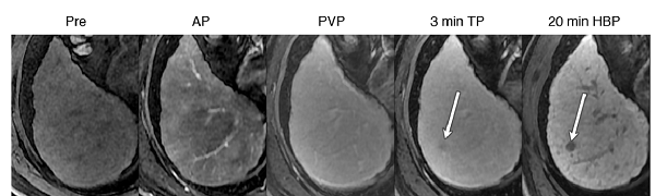 病例展示:钆塞酸二钠早期肝癌诊断优势,下图显示钆塞酸二钠对于普通增强显示不清的早期肝癌有明显优势(白箭头所示早期肝癌病灶肝胆期为低信号)。