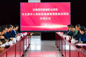 3月11日上午,云南医药健康职业学院与玉溪市人民医院合作举办的“健康管理医教协同班”开班仪式在医院7号楼8楼会议室举行。此次开班标志着双方在健康管理人才培养领域的合作迈入实质性阶段,院校携手为区域健康事业注入新动能。