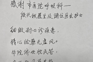 近日,玉溪市人民医院呼吸与危重症医学科的医师办公室里,涌动着暖暖的医患温情——90岁的张奶奶在家人搀扶下,将一张亲笔书写的诗作递到医护人员手中,“细致耐心诊疾患,精心给药无虚风;华佗济世忧民苦,高尚医风民共崇”,短短四句,字字凝情。